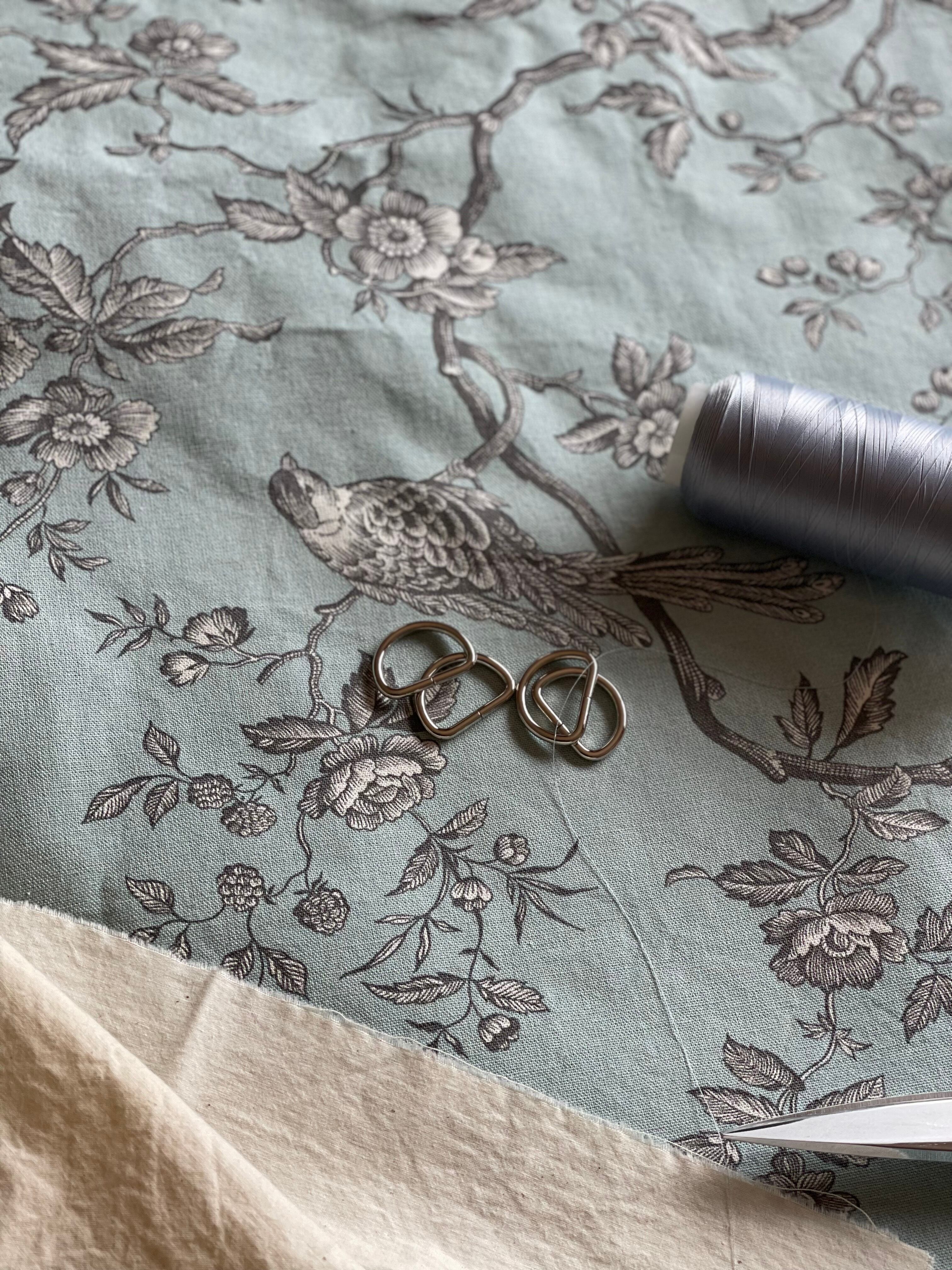 フランスらしい綺麗なブルー地に上品な花と鳥がプリントされた素材